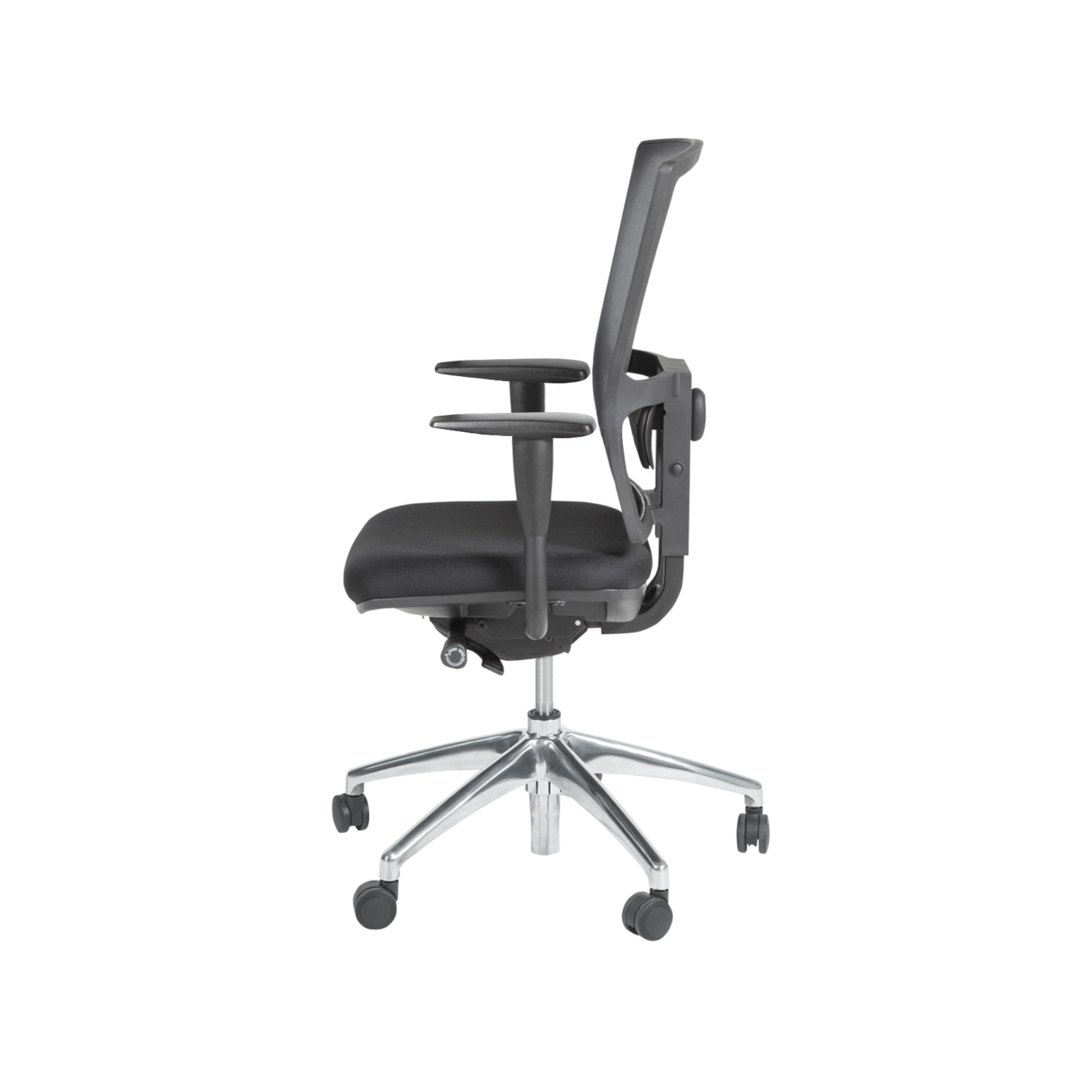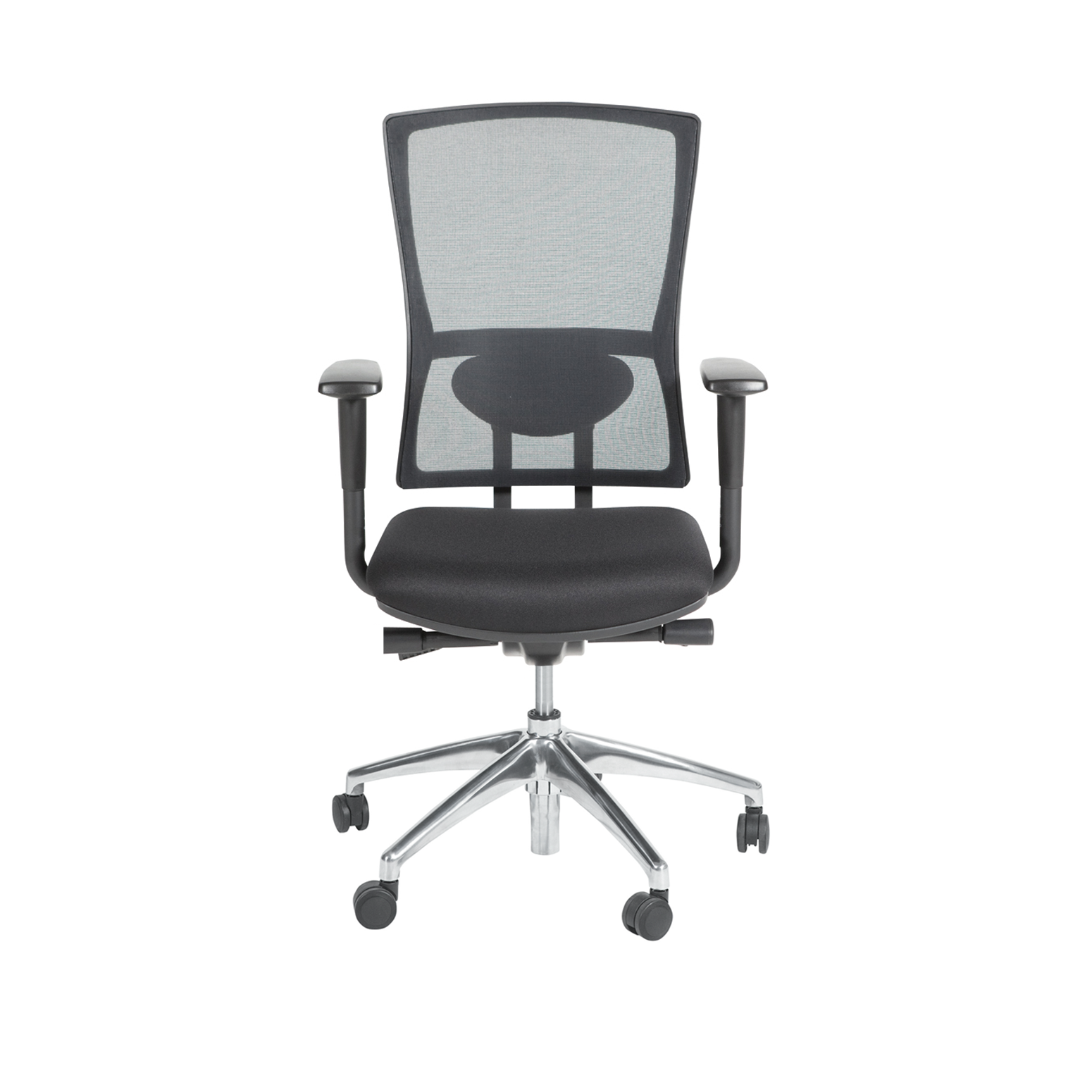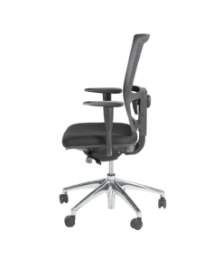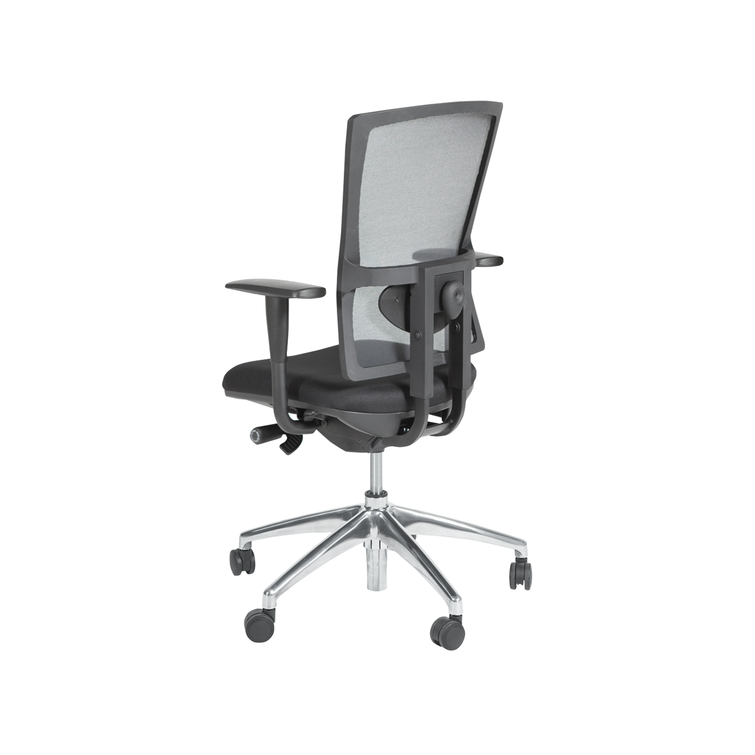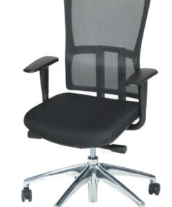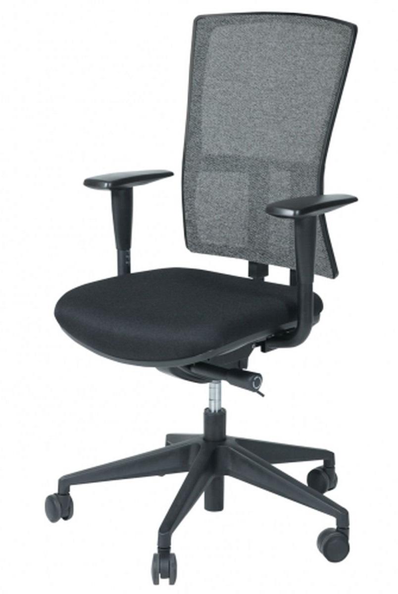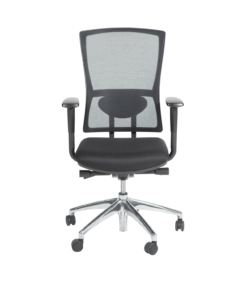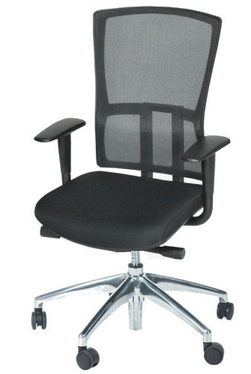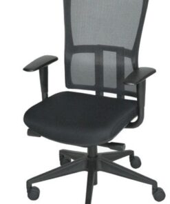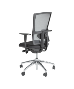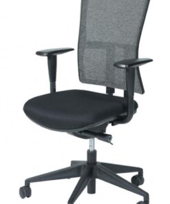 Zitting zwart gestoffeerd. Rug mesh zwart. Permanent rugcontact.